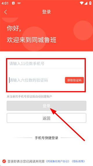 3、在登錄頁面,輸入手機(jī)號(hào),獲取驗(yàn)證碼后輸入驗(yàn)證碼,點(diǎn)擊登錄,完成登錄操作。