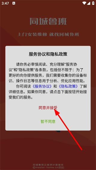 1、在服務(wù)協(xié)議和隱私政策彈窗中,點(diǎn)擊同意,進(jìn)入同城魯班首頁。