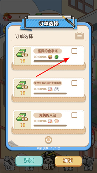 3、在訂單選擇界面,勾選如怪異的金字塔之類的訂單,這是承接制作任務(wù)的關(guān)鍵操作,勾選后可開始制作并獲取相應(yīng)收益。