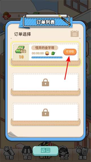 4、當(dāng)訂單完成后,點擊可領(lǐng)取按鈕可獲取訂單收益,這是積累資源的關(guān)鍵操作,及時領(lǐng)取收益可用于后續(xù)店鋪升級業(yè)務(wù)拓展。