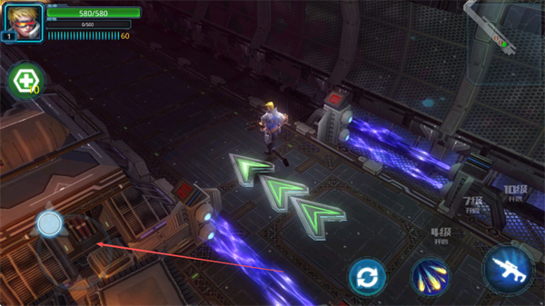 1、通過左側(cè)虛擬搖桿控制角色移動,跟隨綠色箭頭指引的路徑探索關(guān)卡。