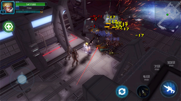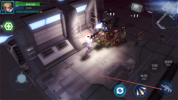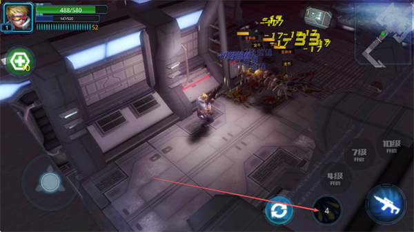2、遇到敵人時,利用右側(cè)槍械按鈕發(fā)動攻擊,對敵人造成傷害,注意躲避敵人的反擊。