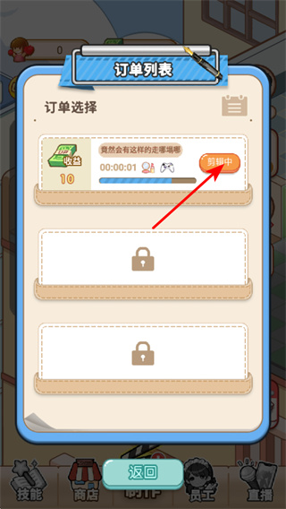 1、游戲中點(diǎn)擊帶有完成標(biāo)識(shí)的任務(wù)圖標(biāo),可進(jìn)入訂單列表界面,這是領(lǐng)取任務(wù)收益、推進(jìn)業(yè)務(wù)進(jìn)程的關(guān)鍵操作。