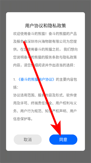 1、打開奮斗的熊貓,在隱私政策彈窗中,點擊同意。