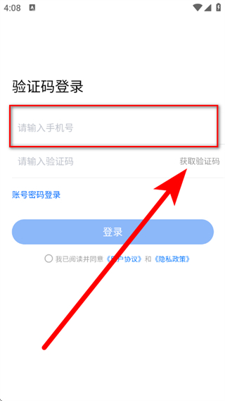 3、在驗證碼登錄頁面,輸入手機(jī)號,點擊獲取驗證碼。