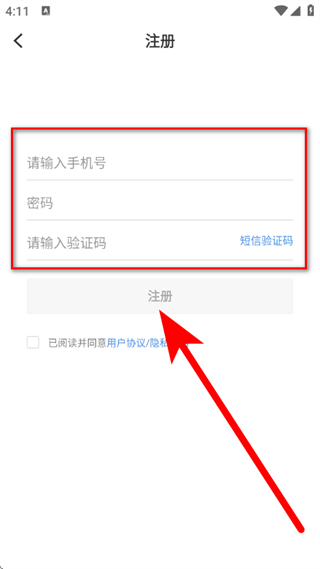 4、輸入手機(jī)號(hào)、密碼、驗(yàn)證碼后,點(diǎn)擊注冊(cè)。