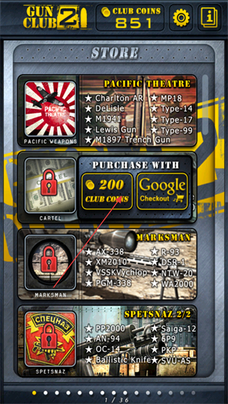 1、進入游戲后在主頁第一頁上可以花費金幣購買不同的地圖適用的槍支。