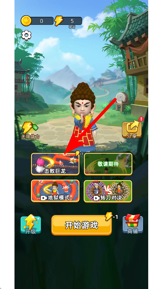 1、進入游戲界面后,點擊擊敗巨龍模式,這是開啟該特色關卡的入口,選擇后即可進入巨龍?zhí)魬?zhàn)關卡。