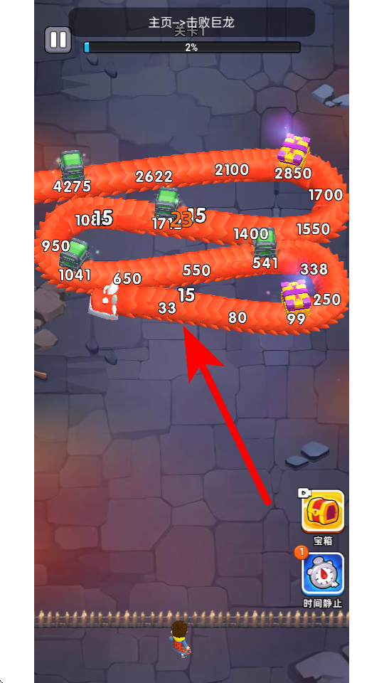 2、在擊敗巨龍關卡中,攻擊巨龍的身體區(qū)域,通過持續(xù)攻擊來推進關卡進度,逐步削減巨龍的生命值。