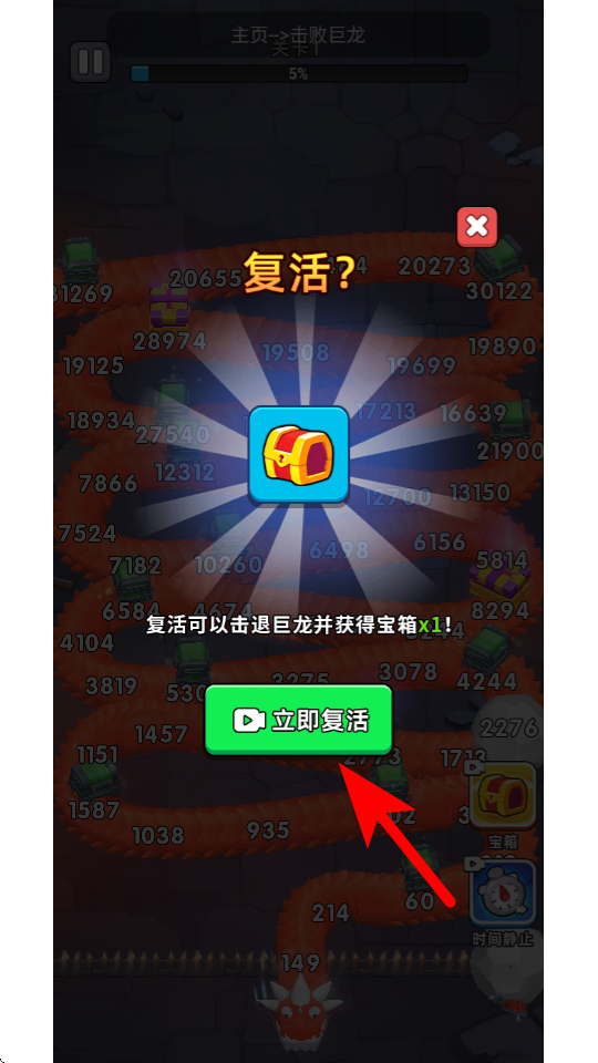 4、若是巨龍到達柵欄里則戰(zhàn)斗失敗,點擊立即復活,復活后可擊退巨龍并獲得寶箱,繼續(xù)參與關卡挑戰(zhàn)。