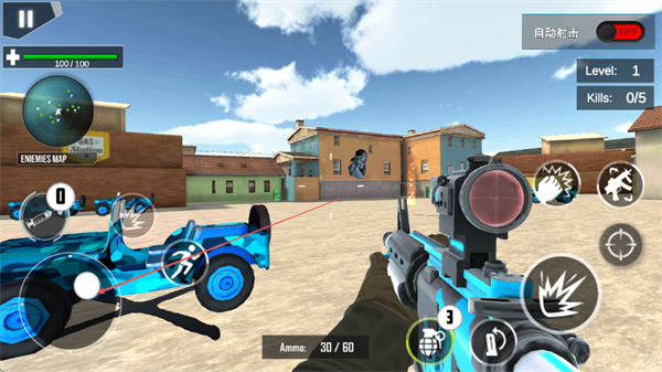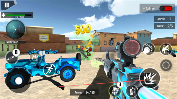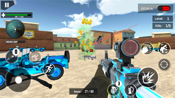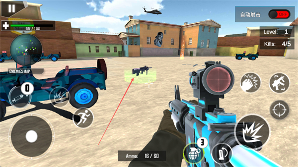 1、通過(guò)左側(cè)虛擬搖桿控制移動(dòng),右側(cè)瞄準(zhǔn)射擊,利用槍械瞄準(zhǔn)敵方目標(biāo),精準(zhǔn)射擊消滅敵人。