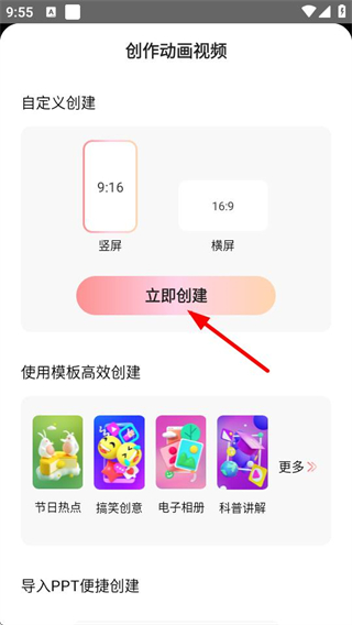 3、在創(chuàng)作動畫視頻頁面選擇比例,點(diǎn)擊立即創(chuàng)建進(jìn)入創(chuàng)作界面。
