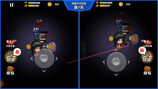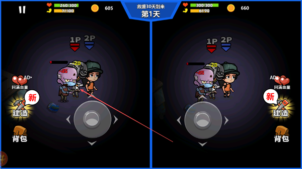 2、夜晚會遭遇喪尸攻擊,與隊友2P協(xié)同作戰(zhàn),共同消滅喪尸,注意躲避攻擊,保持自身血量。