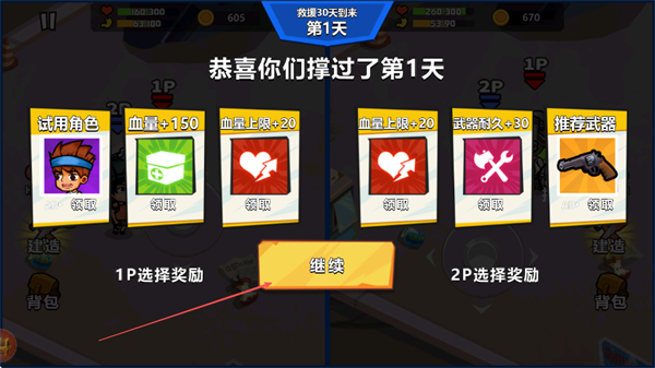 4、成功撐過一天后,可選擇獎勵如血量提升、武器耐久增加等,點擊繼續(xù)進入下一天,持續(xù)生存下去,完成我撐30天到來的挑戰(zhàn)。