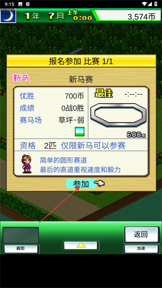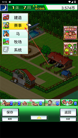 1、游戲主要就是培育馬匹參加比賽提高牧場知名度,點擊菜單欄中的賽事查看當前的賽事計劃。