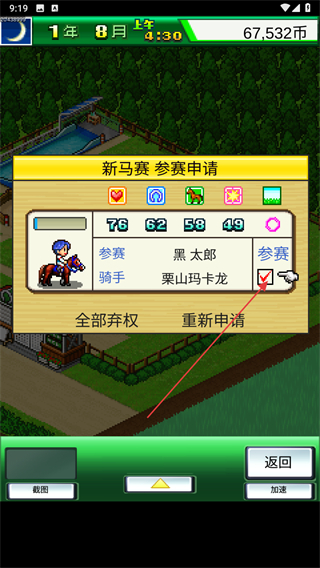 3、報名需要選擇參賽馬,根據(jù)馬匹的各項屬性評分進行選擇合適的馬參加比賽。
