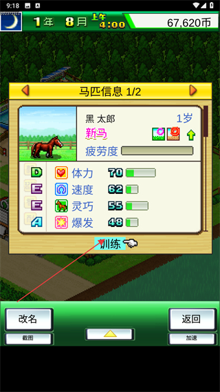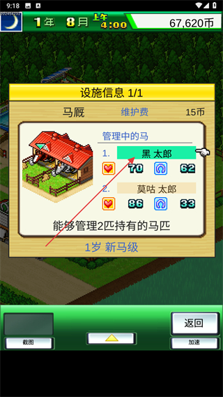 1、在牧場上點(diǎn)擊馬廄可以查看到馬匹的心情指數(shù)和身體指數(shù),點(diǎn)擊馬的名字進(jìn)行管理。