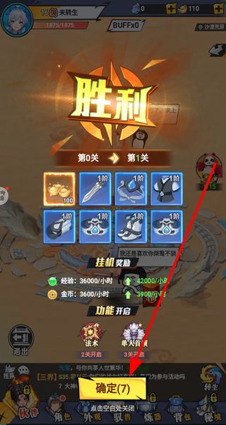 4、勝利后領(lǐng)取獎(jiǎng)勵(lì),獲取金幣、裝備等資源,點(diǎn)擊確定繼續(xù)游戲,開啟新的關(guān)卡和挑戰(zhàn),豐富游戲體驗(yàn)。