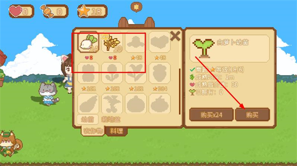 3、進入農場界面,點擊購買種子,可以種植在土地上,等待收獲。