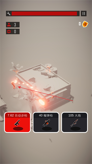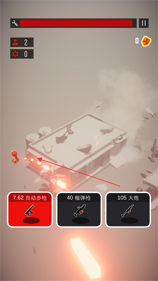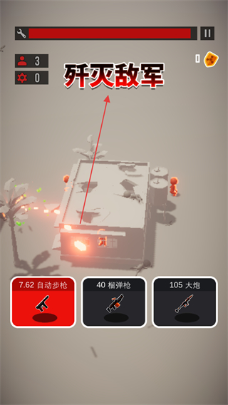 1、選擇武器如7.62自動步槍、40榴彈槍、105大炮,對敵方目標(biāo)發(fā)起攻擊,消滅紅色小人敵人。