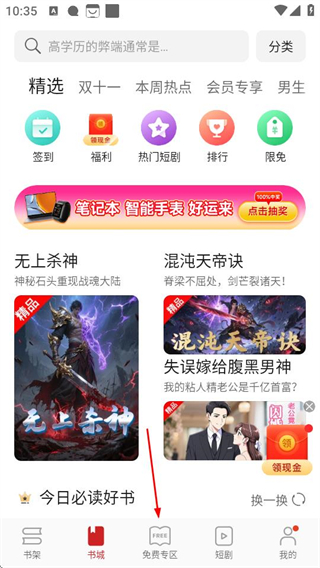 1、在閱讀快看版首頁,點擊底部免費專區(qū)選項,進入免費專區(qū)頁面。