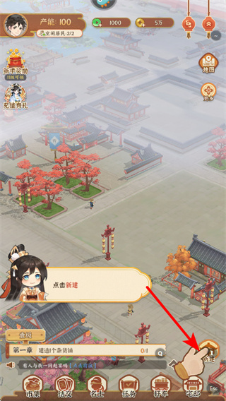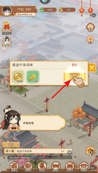 3、根據(jù)任務提示點擊去完成按鈕,可開展如建造個雜貨鋪之類的經(jīng)營任務,這是積累資源,完成后可獲取建設(shè)獎勵。