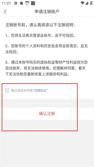 5、在申請(qǐng)注銷(xiāo)賬戶頁(yè)面,勾選協(xié)議后點(diǎn)擊確認(rèn)注銷(xiāo),完成注銷(xiāo)。