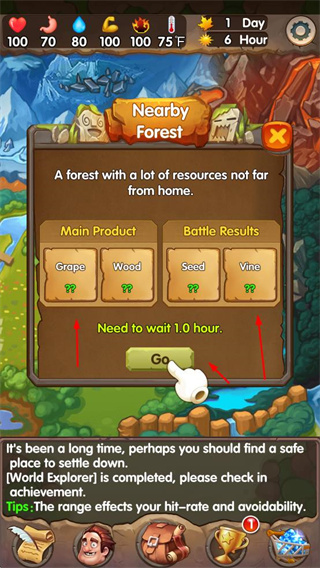 1、前往附近資源點(diǎn),等待一定時(shí)間后獲取資源,積累生存資源。