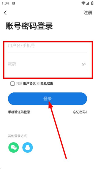 4、在賬號(hào)密碼登錄頁面,輸入用戶名/手機(jī)號(hào)和密碼,點(diǎn)擊登錄,完成登錄操作。