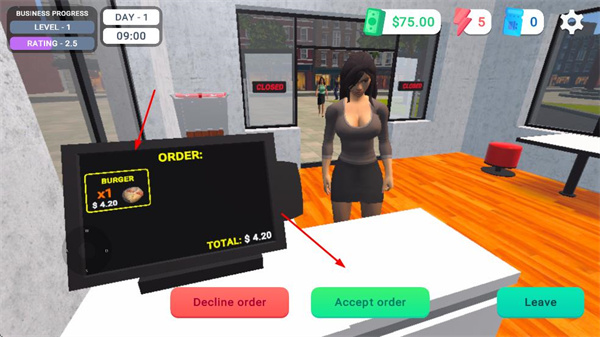 1、接收顧客訂單,選擇接受訂單開啟制作流程,積累營(yíng)業(yè)額與店鋪評(píng)級(jí)。
