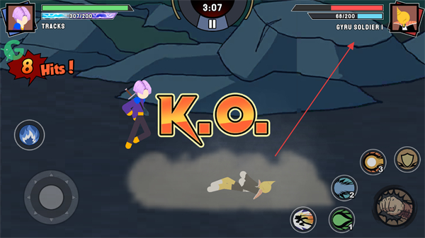 3、持續(xù)攻擊敵方,使其血量耗盡,出現(xiàn)K.O.標(biāo)識,贏得單局勝利。