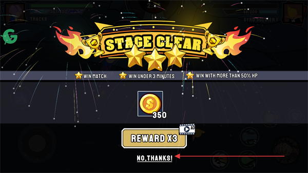 4、完成關(guān)卡后,可選擇領(lǐng)取獎勵或跳過,根據(jù)三星條件如3分鐘內(nèi)勝利爭取滿星通關(guān)。