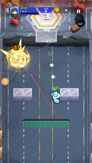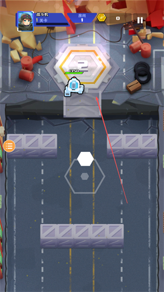 1、操控機甲在道路上移動,收集藍色六邊形道具,提升機甲等級。