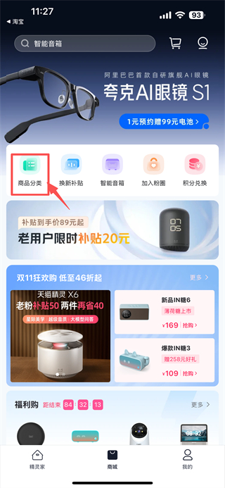 2、在商城頁面,點(diǎn)擊商品分類選項(xiàng),進(jìn)入商品分類頁面。