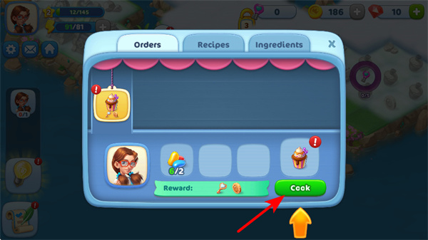 2、在訂單界面點(diǎn)擊Cook按鈕,可制作如紙杯蛋糕之類的食品,這是獲取資源和經(jīng)驗(yàn)的關(guān)鍵操作,能提升角色等級(jí)。