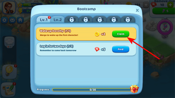 4、完成任務(wù)后點(diǎn)擊Claim按鈕可領(lǐng)取獎(jiǎng)勵(lì),這是積累游戲資源的關(guān)鍵操作,領(lǐng)取后可用于升級(jí)建筑或解鎖了新的角色。