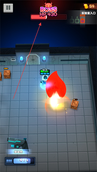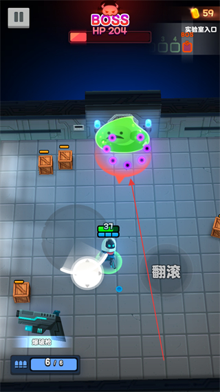 1、面對(duì)BOSS時(shí),利用翻滾技能躲避攻擊,同時(shí)用爆裂槍持續(xù)輸出,削減其HP。