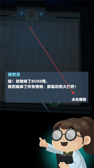 4、消滅BOSS后,點(diǎn)擊繼續(xù)回到大廳,完成關(guān)卡挑戰(zhàn),可繼續(xù)探索新的實(shí)驗(yàn)室區(qū)域。