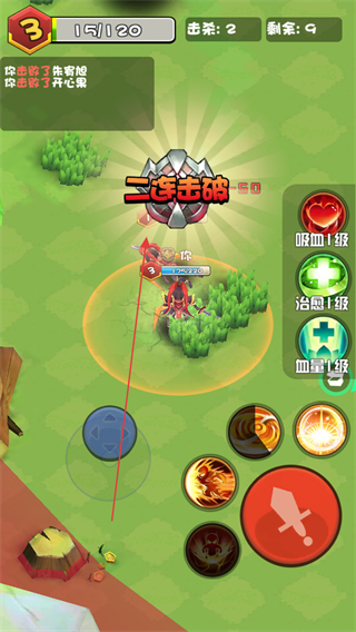 4、升級(jí)時(shí)選擇技能如吸血、治愈、血量升級(jí),增強(qiáng)自身戰(zhàn)力,達(dá)成二連擊破等成就,持續(xù)消滅敵人,成為亂斗王者。