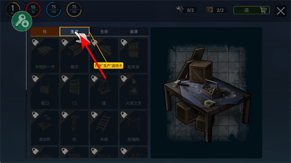 1、在工藝菜單中點(diǎn)擊生產(chǎn)選項(xiàng),可查看生產(chǎn)類道具的制作配方,這是獲取工具、建筑的關(guān)鍵操作,可根據(jù)資源情況選擇制作。