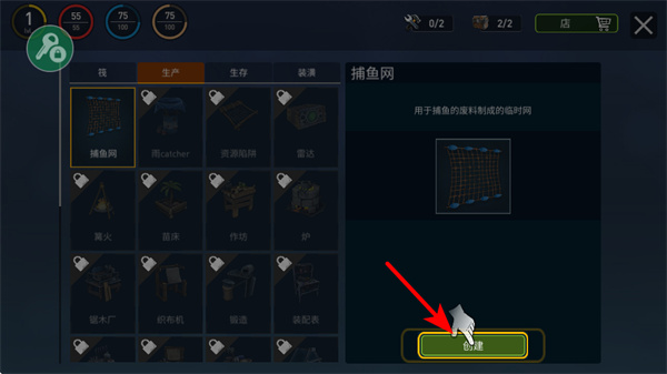 2、選擇如捕魚網(wǎng)之類的生產(chǎn)道具后,點(diǎn)擊創(chuàng)建按鈕可開始制作,這是提升生存能力的關(guān)鍵操作,制作后能用于捕魚獲取食物。