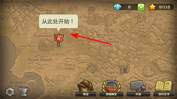 1、在地圖界面點(diǎn)擊帶有紅色旗幟的從此處開(kāi)始區(qū)域,可進(jìn)入防御關(guān)卡,這是游戲開(kāi)始的關(guān)鍵操作,才能開(kāi)啟塔防戰(zhàn)斗。