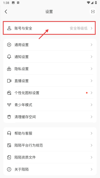 3、在設(shè)置頁(yè)面,點(diǎn)擊賬號(hào)與安全選項(xiàng),進(jìn)入賬號(hào)與安全頁(yè)面。
