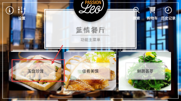 1、進(jìn)入藍(lán)情餐廳應(yīng)用,點(diǎn)擊玉盤珍饈板塊,瀏覽該分類菜品。