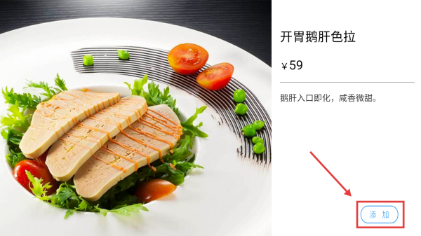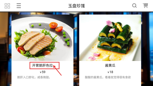 2、在玉盤珍饈頁面,選擇開胃鵝肝色拉菜品,進(jìn)入詳情頁。