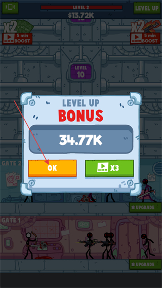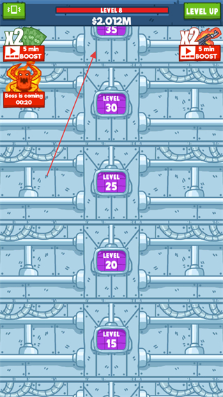 2、當(dāng)游戲上方的經(jīng)驗(yàn)值滿后可以點(diǎn)擊右上角的升級(jí)按鈕,選擇OK則可以消耗金錢(qián)進(jìn)行升級(jí)解鎖下面的樓層。