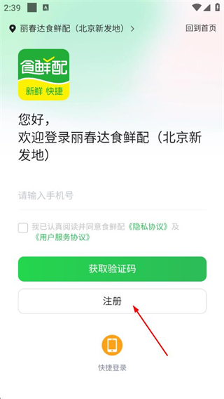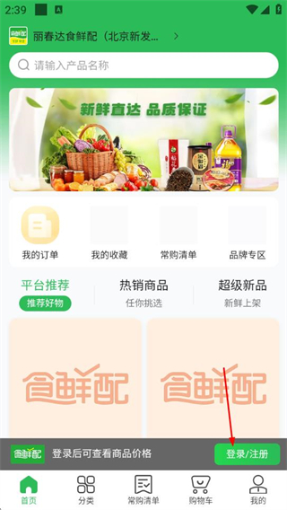 1、在食鮮配首頁,點擊右下角登錄注冊選項,進入登錄注冊頁面。