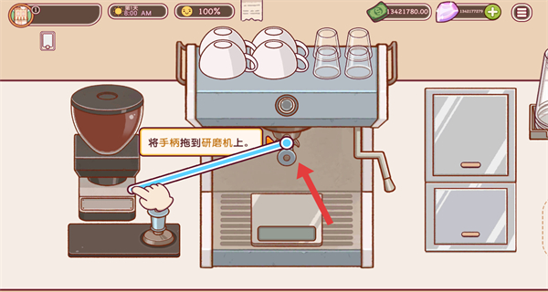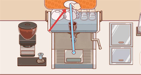 1、制作咖啡時(shí),將手柄拖到研磨機(jī)上,啟動(dòng)咖啡豆研磨流程,為萃取濃縮咖啡做準(zhǔn)備。
