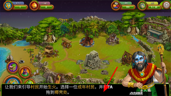 3、根據(jù)提示將村民拖動到椰殼處,可完成生火等生存任務(wù),這是保障村民生存的關(guān)鍵操作,拖動時需確保村民到達指定位置。