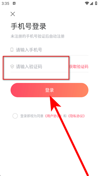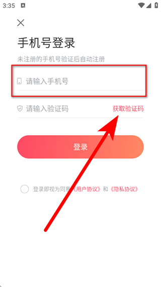 3、在登錄頁面,輸入手機(jī)號(hào),點(diǎn)擊獲取驗(yàn)證碼。